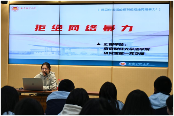 为进一步强化青少年法律意识,帮助其明晰网络暴力的定义、表现形式及危害,提升辨别与应对网络暴力的能力,10月27日,我们研究生第一党支部主动走进南京市玄武中等专业学校(樱驼花园校区),面向该校学生开展了一场主题鲜明、内容务实的“拒绝网络暴力”普法宣讲活动。