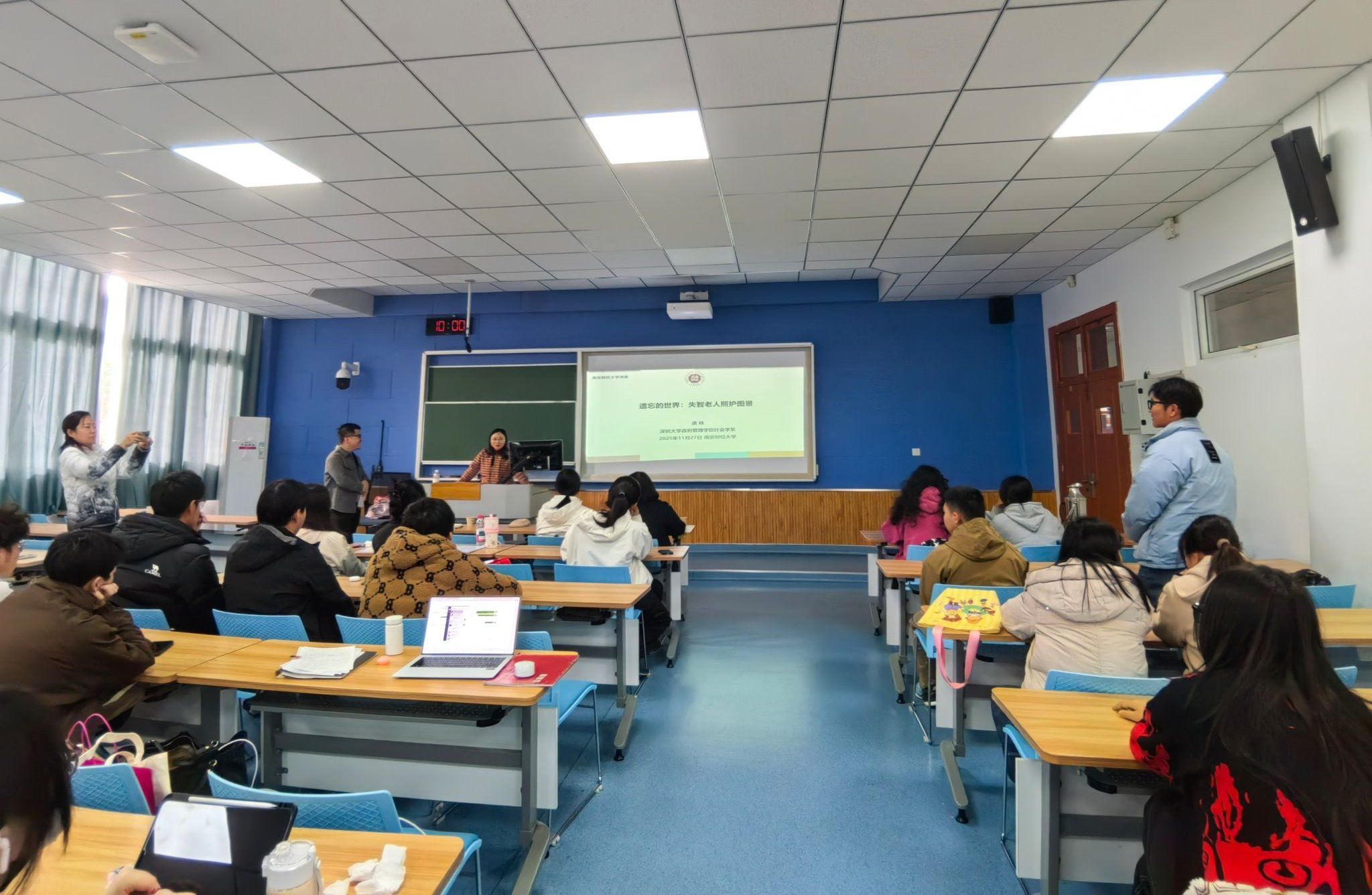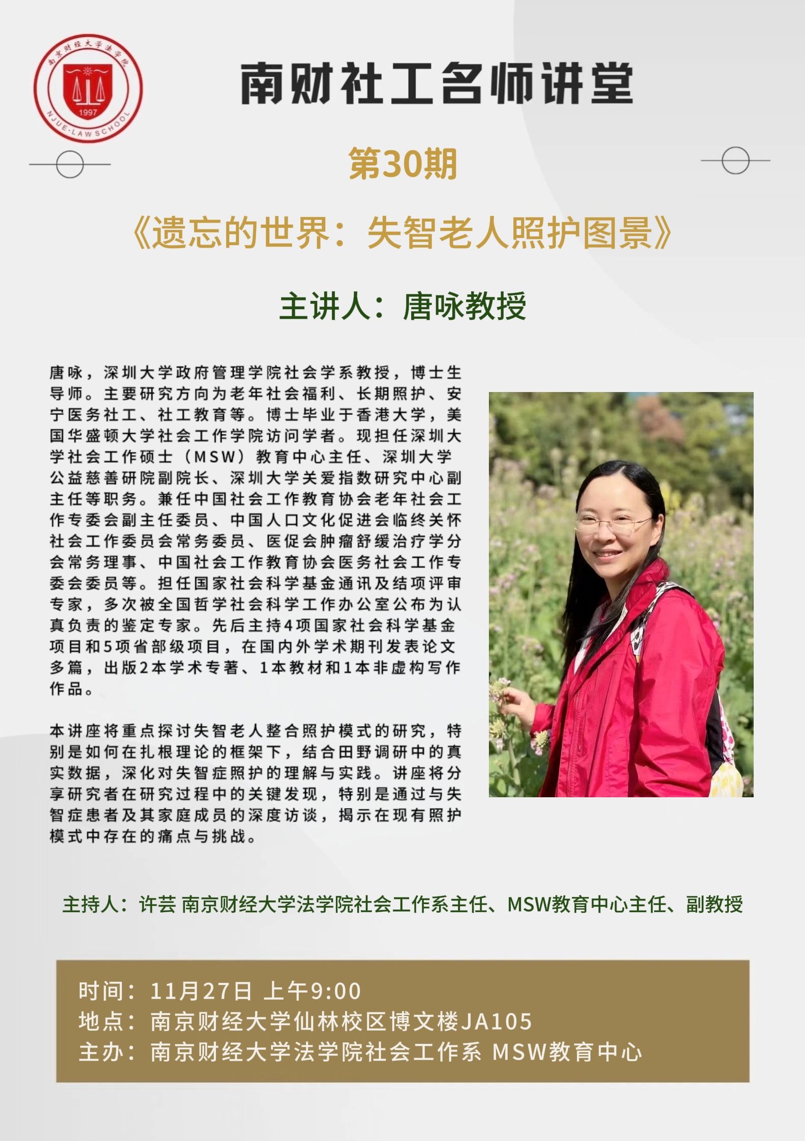 11月27日上午,深圳大学政府管理学院社会学系博士生导师、社会工作专业硕士教育中心主任唐咏教授应邀为我们师生带来主题为“遗忘的世界:失智老人照护图景”的学术讲座。本次讲座由我们社会工作系主任、MSW教育中心主任许芸副教授主持,社工系甘诺副教授、仲鑫副教授、高丽茹副教授、社工系林景副主任、张亮亮博士、王颖捷博士等老师,全体硕士研究生和部分本科生参加了此次讲座。