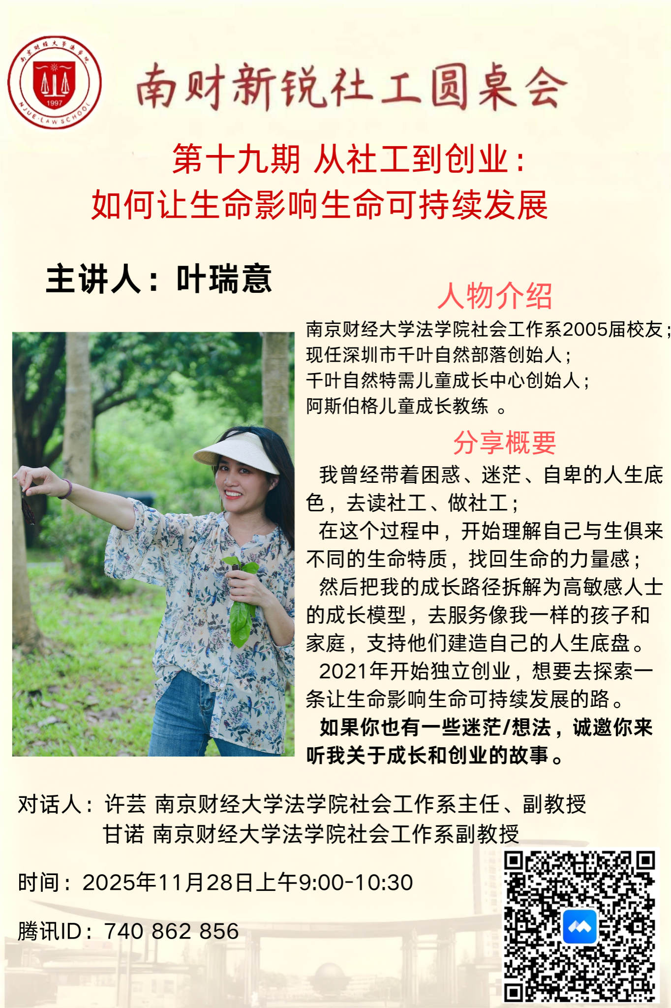 11月28日上午,我们特色活动“南财新锐社工圆桌会”第十九期线上活动圆满开展。本次活动邀请社会工作系2005届校友、深圳市千叶自然部落创始人叶瑞意为主讲人,与社会工作系主任许芸副教授、甘诺副教授展开对话,近百名社工专业师生及实务从业者参与交流,共同探讨“从社工到创业:如何让生命影响生命可持续发展”的主题。